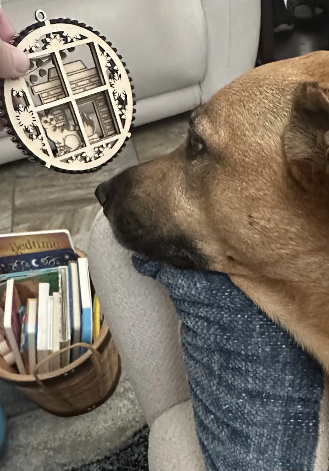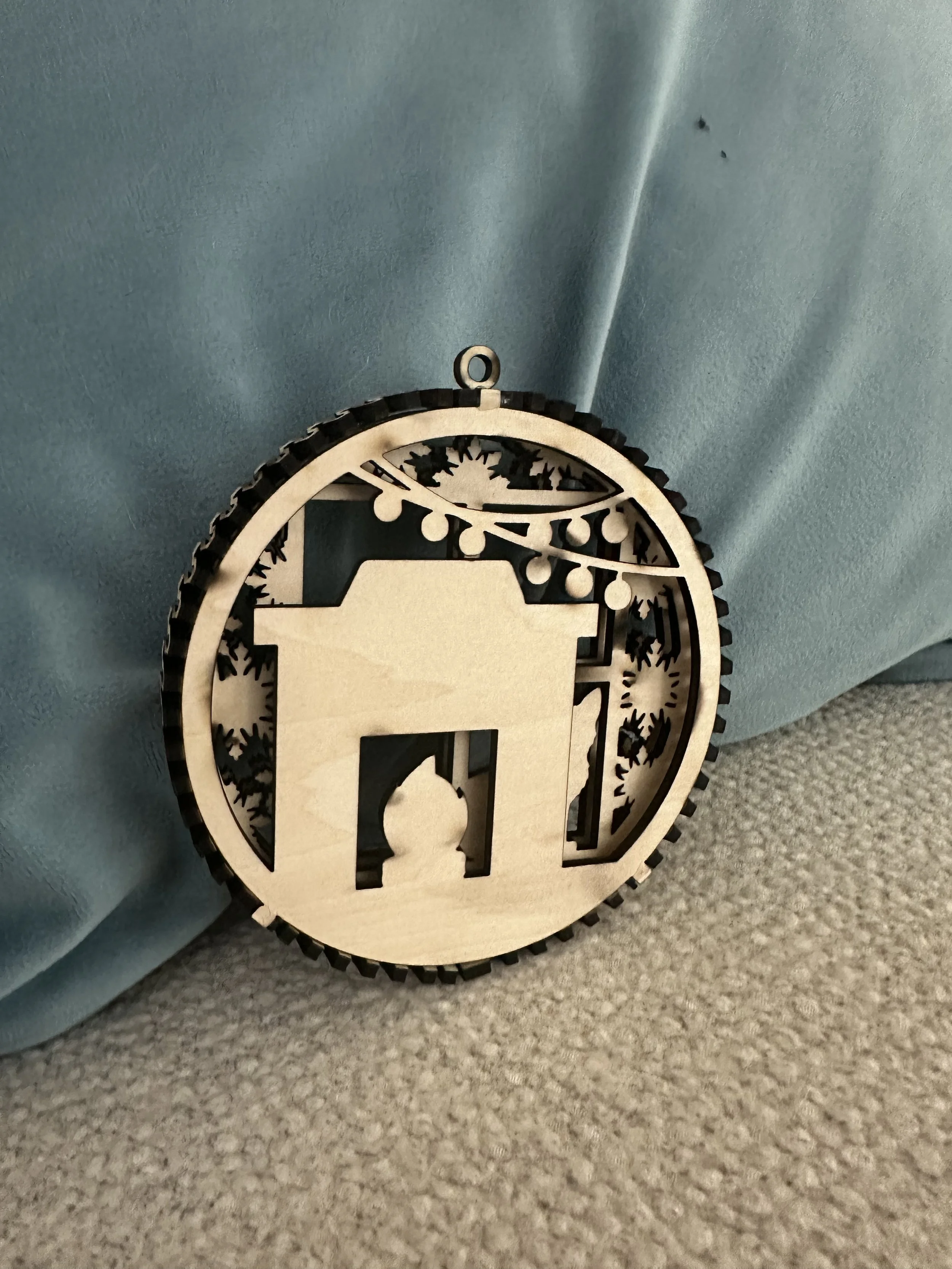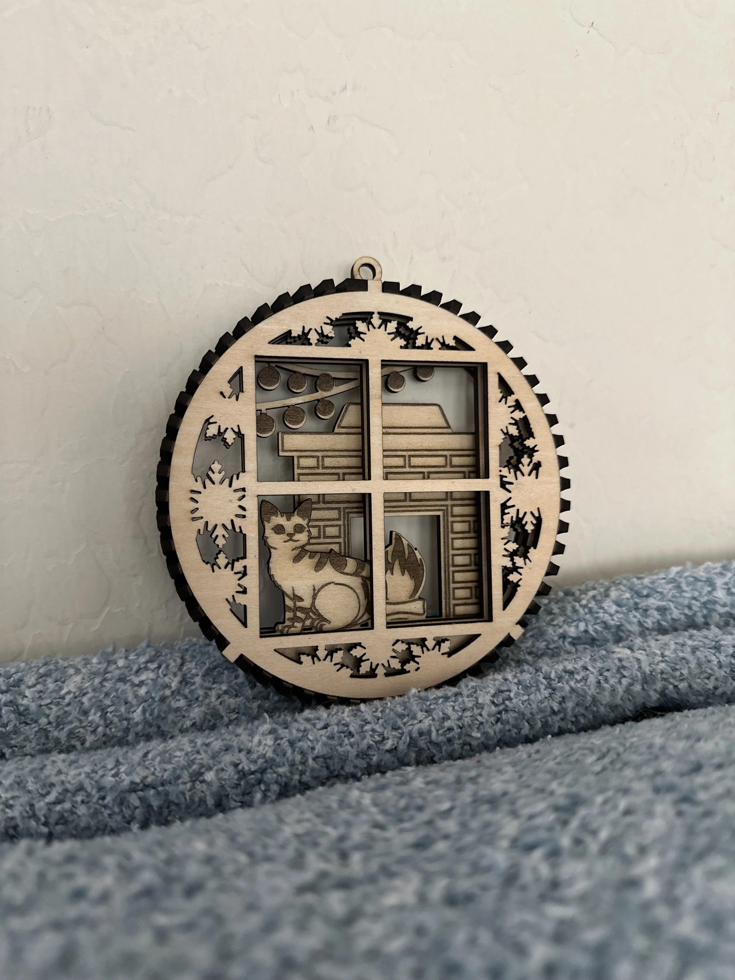 Bring warmth and charm to your holiday décor with this beautifully detailed laser-cut wooden Christmas ornament. Featuring a cozy winter scene viewed through a window, this design showcases a sweet cat sitting by a crackling fireplace, with festive holly and berries framing the view.
