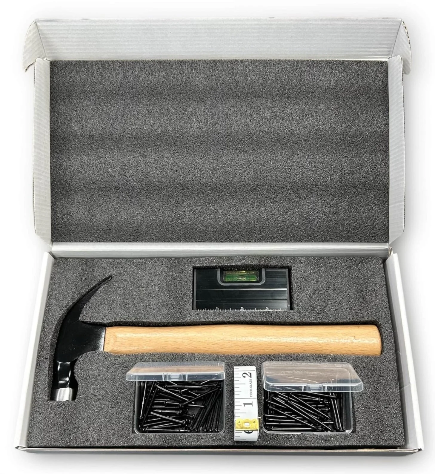 Now taking pre-orders for this incredible gift set. The handle will be custom engraved with your text. It comes with 100 black steel nails, a compact level, and flexible tape in a sturdy, foam padded gift box, ready to wrap. The head is heavy, magnetic, and “sail proof.” (It won’t go sailing off the handle and through your window!) Available on Cyber Monday, December 2nd, and will be ready in time for Christmas. Corporate gift givers, personal gifters, or a little somethin’ somethin’ to keep your hammer yours, pre-order by November 21st for $44.95 and guarantee delivery in time for Christmas.