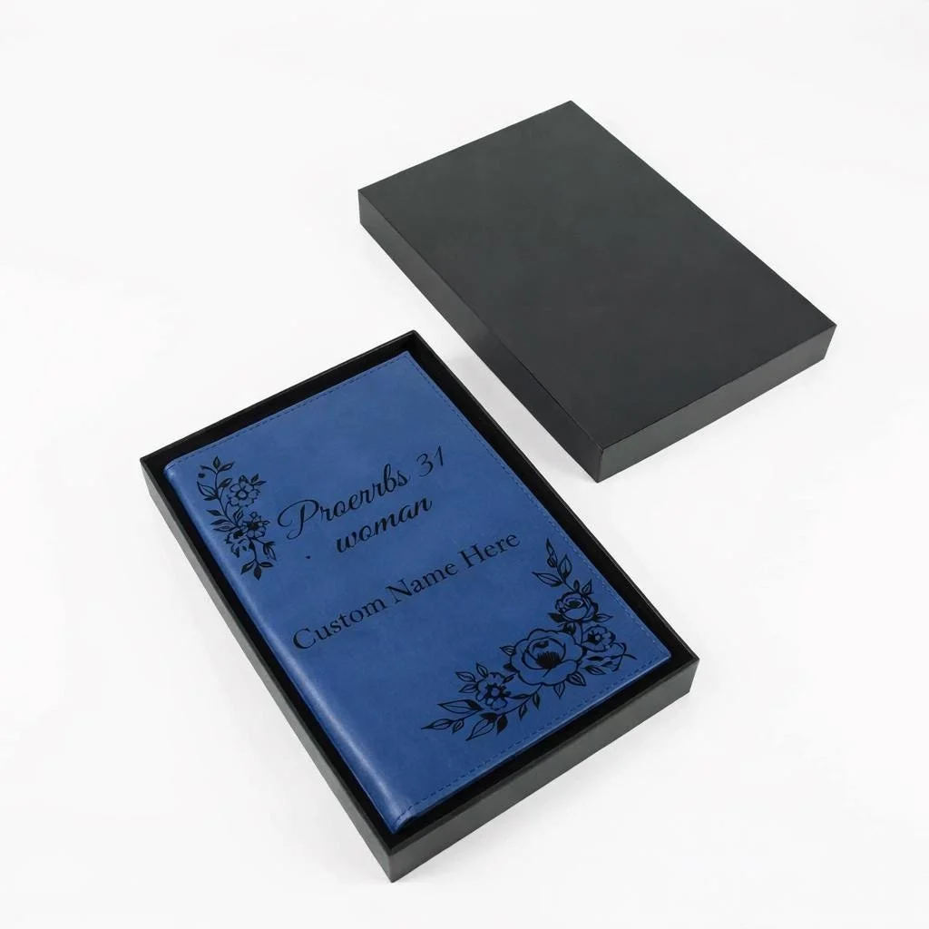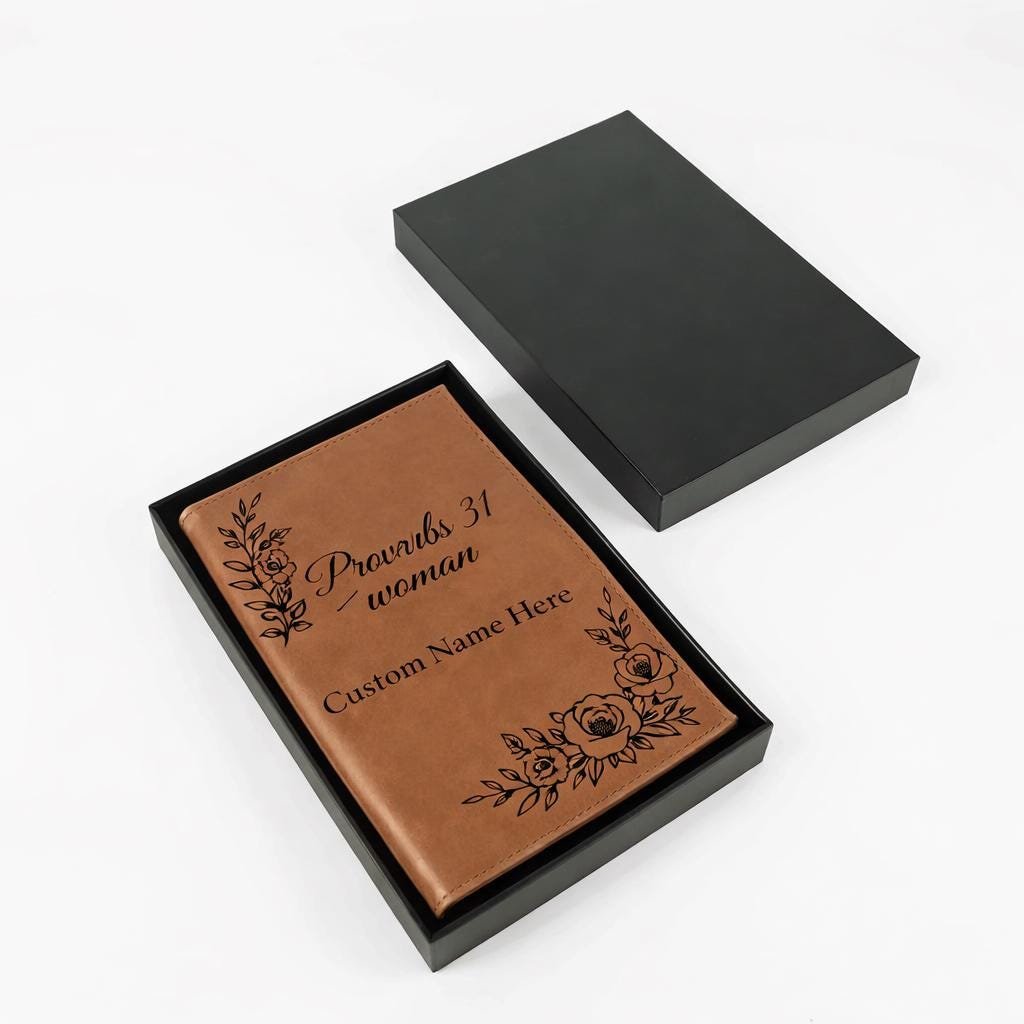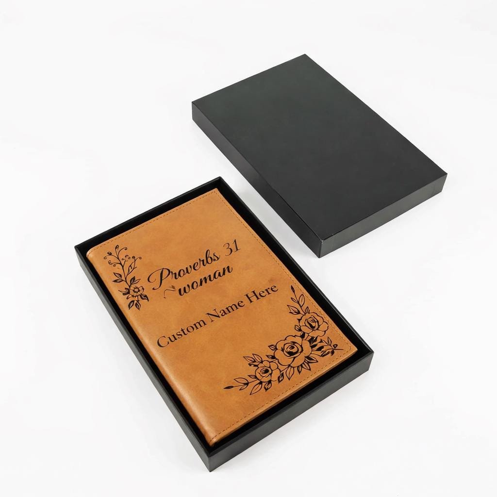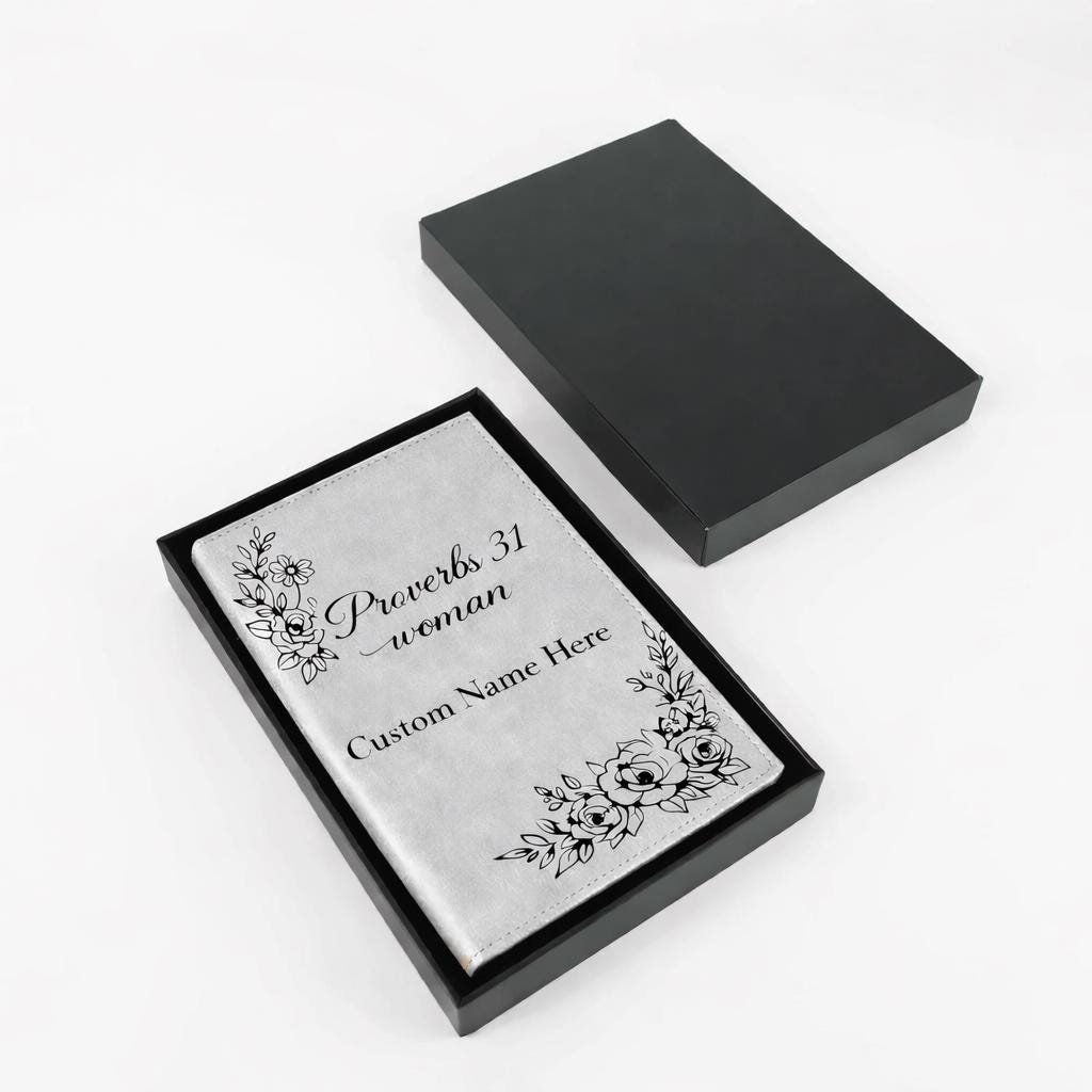 Each journal features elegant floral engraving paired with the words “Proverbs 31 woman” and a custom name, making it a meaningful keepsake for Christian women of all ages.